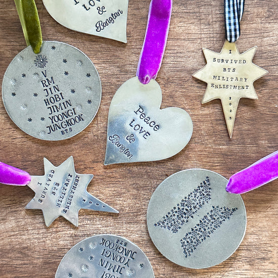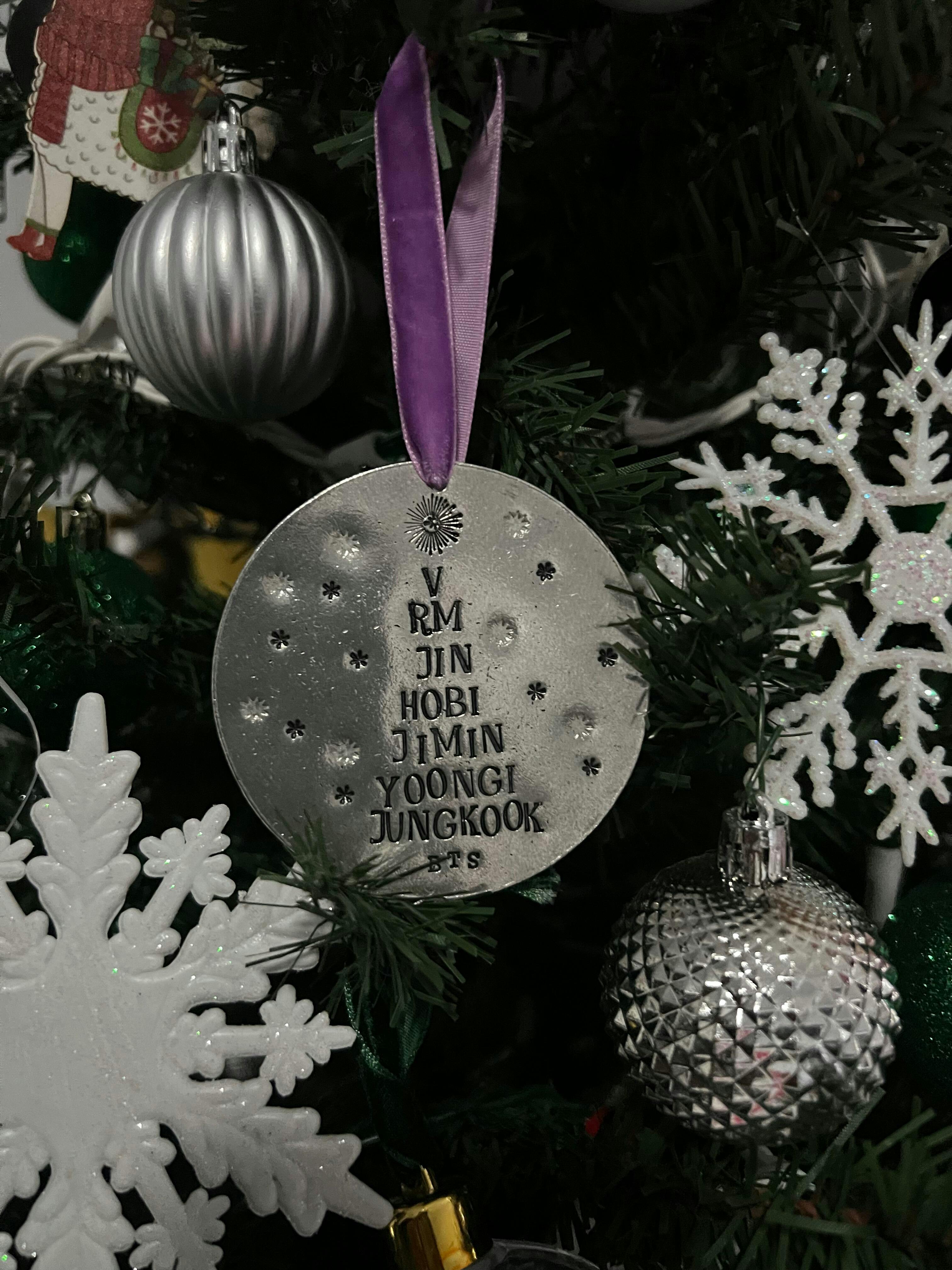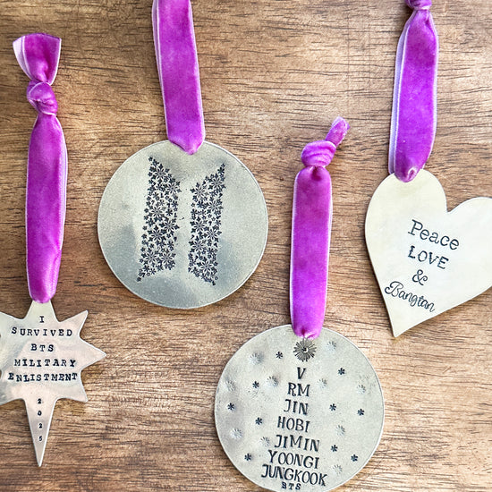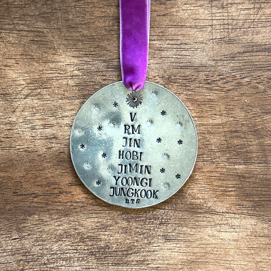 This is a beautiful hand stamped ornament made of high quality pewter. Pewter has a nice weight and a natural quality to it. It will be a keepsake for years! The disc is 2.75" diameter. Finished with ribbon of your choice for hanging. The ornament will come gift wrapped and perfect for sharing with your ARMY bestie.