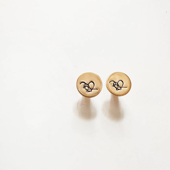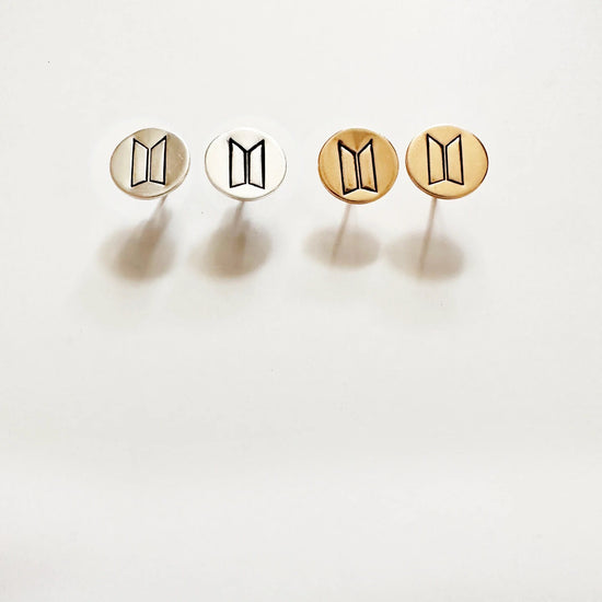 Cute minimal stud earrings featuring either the BTS Logo or Love Yourself heart hand stamped on a silver or gold disc.