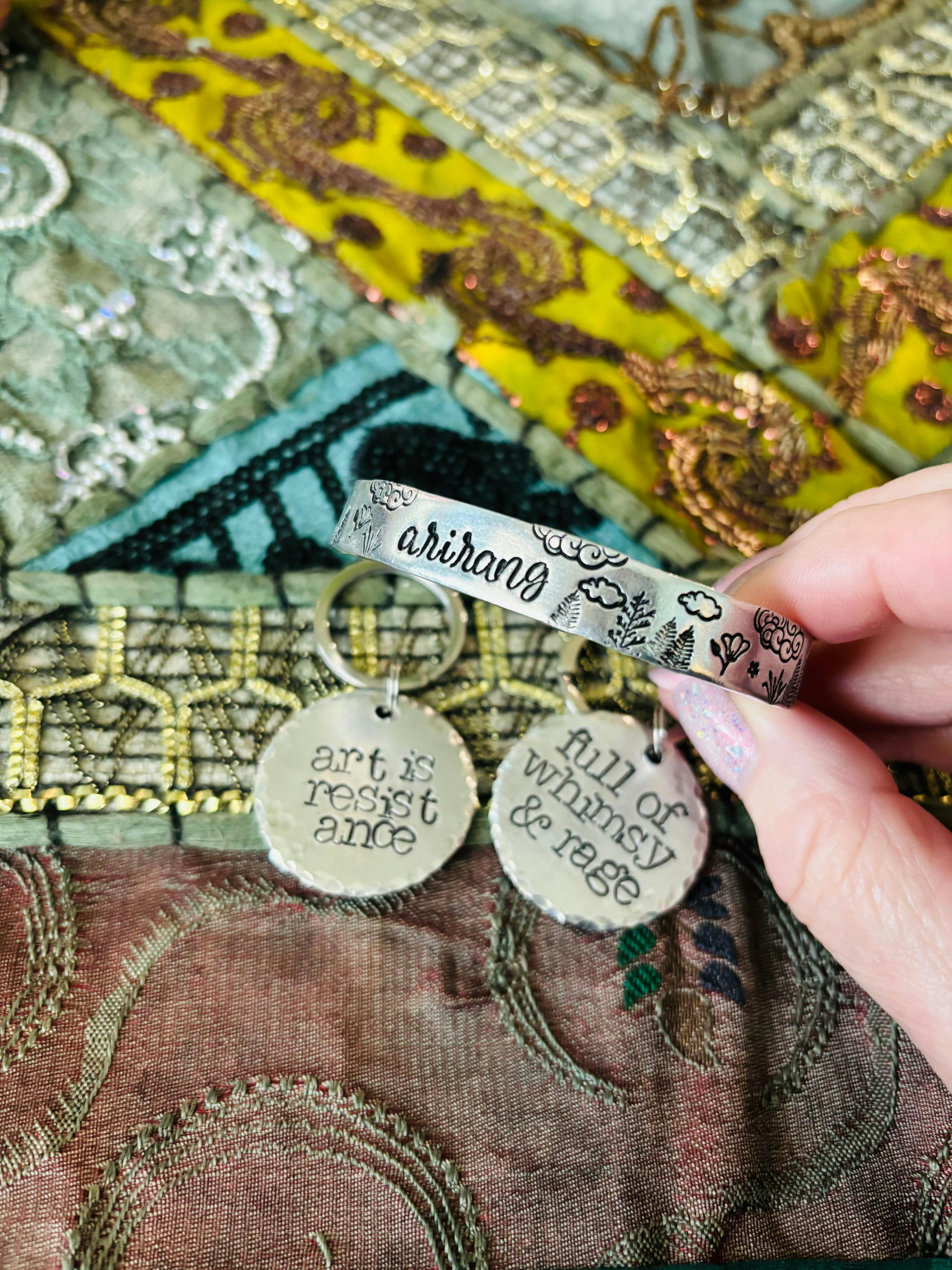 Each letter and design on cuffs are hand stamped with traditional tools, so each item is truly one of a kind. This also means your piece won’t look exactly as pictured. Due to the nature of stamping there may be a slight impression on the back of the cuff.
